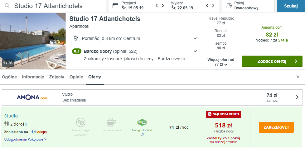Na południu Portugalii wybrałem dla was ofertę zakwaterowania w Studio 17 Atlantichotels. Hotel znajduje się w miejscowości Portimão, która oddalona jest od lotniska w Faro o 71 km. W łatwy sposób dostaniecie się tutaj wypożyczonym samochodem (szczegóły poniżej). Wszystkie apartamenty oraz studia posiadają prywatną łazienkę z wanną, aneks kuchenny i wyposażone zostały w telewizor LCD, klimatyzację. Na terenie całego obiektu można korzystać z bezpłatnego dostępu do sieci WiFi.