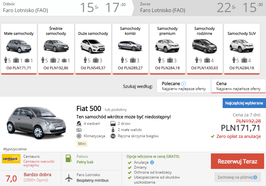 W cenę pakietu wliczyłem także kosztu wypożyczenia samochodu. Posiadając auto na miejscu bez problemu dostaniecie się do miejsca zakwaterowania. Nie będziecie mieli także problemu z przemieszczaniem się wzdłuż południowego wybrzeża Portugalii.