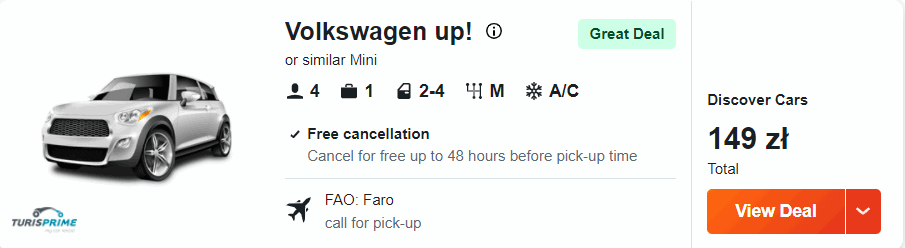 Łatwo, szybko i wygodnie po regionie Algarve poruszać się będziecie wynajętym samochodem. Poza sezonem za wypożyczenie Volkswagena up lub podobnego modelu zapłacicie tylko 21 PLN/doba.