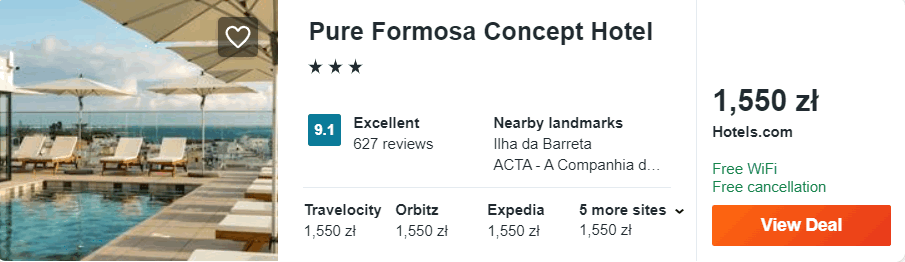 Na miejscu zakwaterowani będziecie w 3* hotelu Pure Formosa Concept, który znajduje się w miejscowości Olhão. Odległość od portu lotniczego w Faro wynosi niespełna 20 km. W cenę oferty wliczone jest także wypożyczenie samochodu na tydzień.