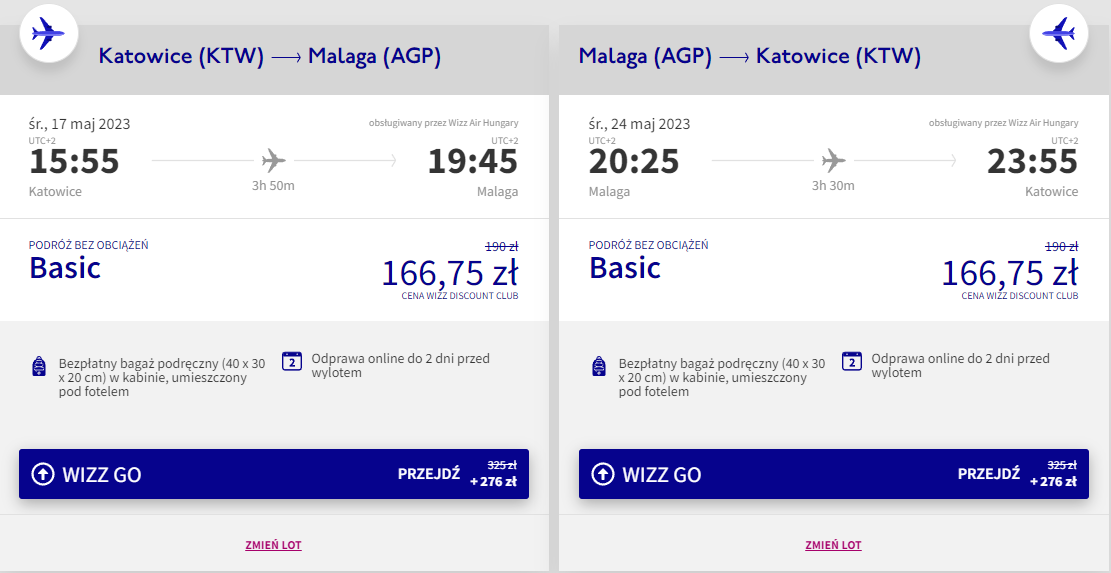 Do Andaluzji udasz się z lotniska Katowice-Pyrzowice w terminie 17-24 maja. W obie strony polecisz na pokładzie samolotów linii Wizz Air z wliczonym małym bagażem podręcznym. Bilety w najniższej cenie dostępne są dla osób z Wizz Discount Club. Chętni na loty bez WDC zapłacą więcej.