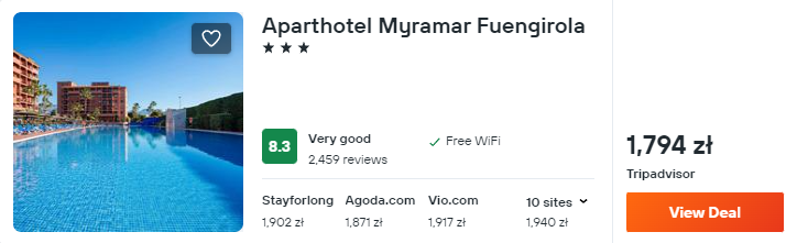 Za pakiet lotów oraz noclegów w aparthotelu zapłacisz 1231 PLN za osobę, pod warunkiem że będziesz podróżować w parze i zatrzymacie się w tym samym pokoju.