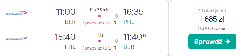 Do Stanów Zjednoczonych udacie w trakcie trwania kalendarzowego lata (8-13 września), z portu lotniczego Berlin Brandenburg. Do Filadelfii i z powrotem polecicie na pokładach samolotów linii American Airlines oraz British Airways z przesiadkami na lotnisku w Londynie. Bez dodatkowych kosztów zabrać ze sobą będziecie mogli bagaż podręczny oraz przedmiot osobisty (mały plecak lub damską torebkę).