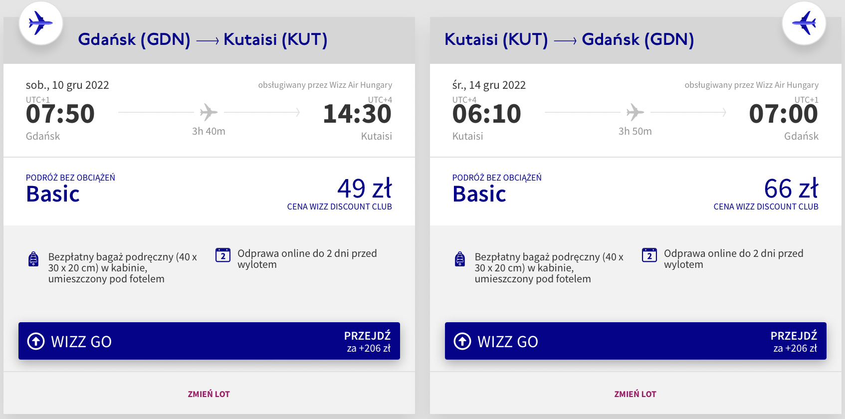 Do Kutaisi polecicie w terminie 10-14 grudnia z lotniska w Gdańsku. Na wypoczynek wybierzecie się bezpośrednio na pokładzie samolotu linii lotniczej Wizz Air. Pamiętajcie, że bilety w najniższej cenie dostępne są dla członków Wizz Discount Club. Chętni na loty bez WDC zapłacą nieco więcej.