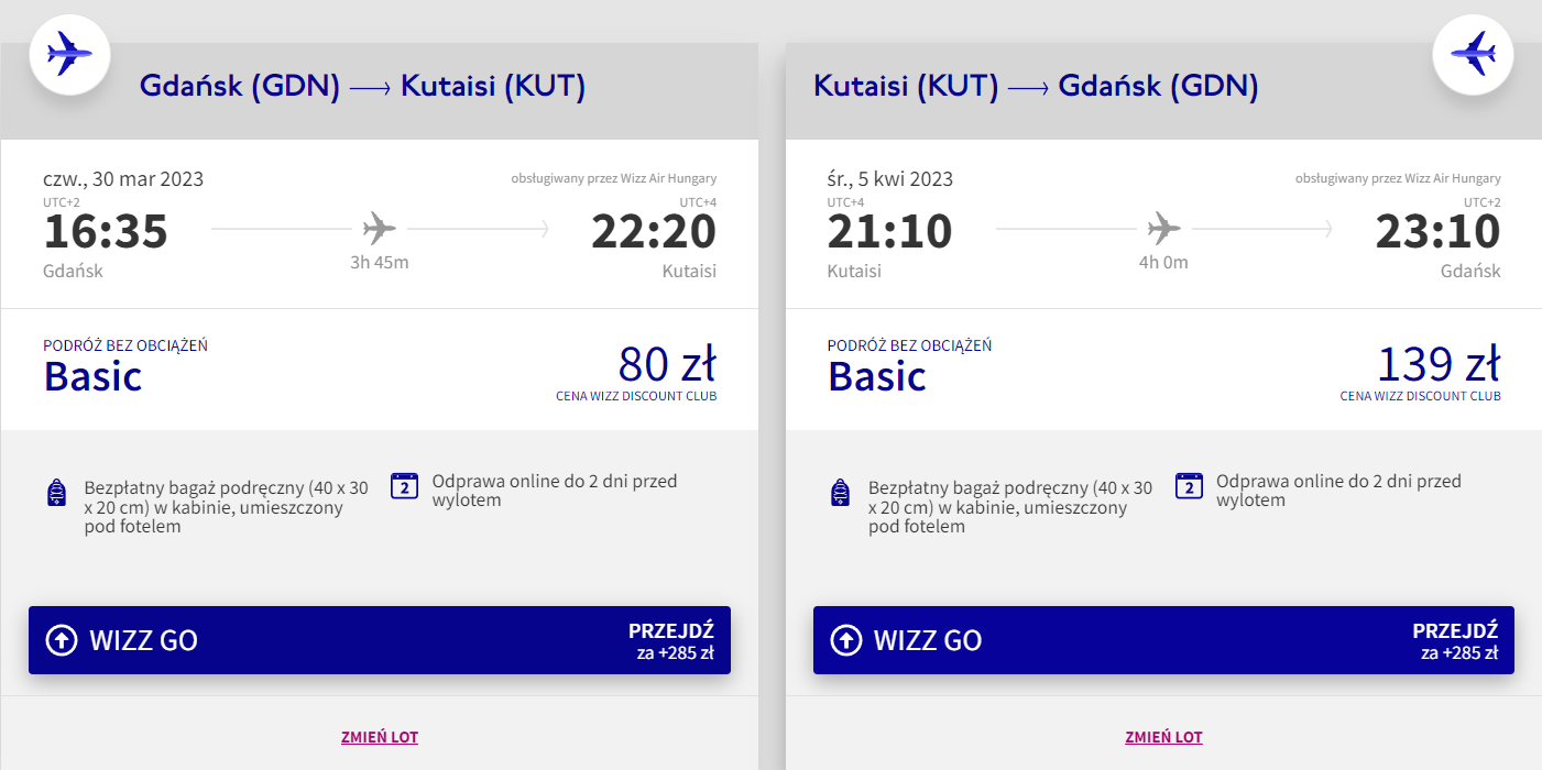 Do Gruzji udasz się w terminie 30 marca – 5 kwietnia. Czeka cię bezpośredni lot z Gdańska, realizowany na pokładzie samolotu linii Wizz Air. Bilety w najniższej cenie zarezerwują posiadacze Wizz Discount Club, pozostałe osoby zapłacą nieco więcej.