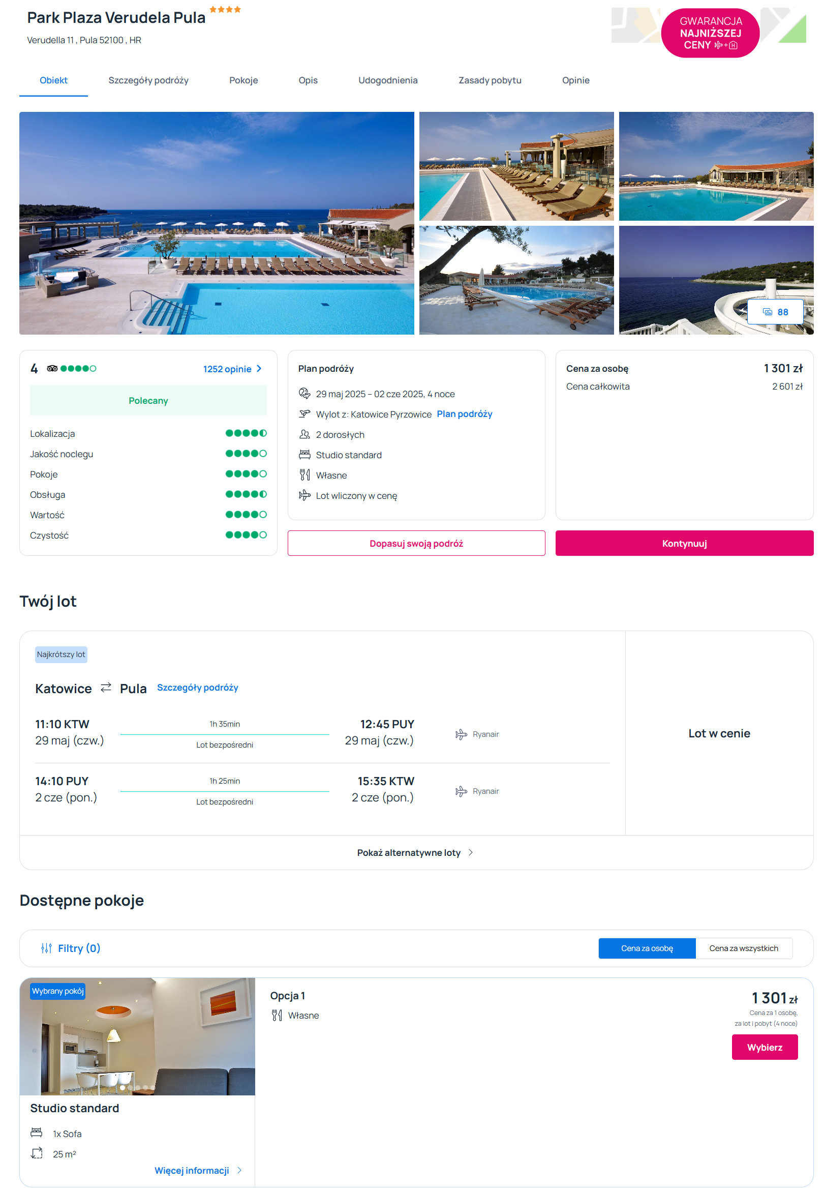 Do Chorwacji wylecisz w czwarte (29 maja) z katowickiego lotniska w Pyrzowicach o 11:10. W drogę powrotną na Górny Śląsk wyruszysz w poniedziałek (2 czerwca), w odlot zaplanowany jest na godzinę 14:10. W obie strony podróżować będziesz bezpośrednio linią Ryanair z bagażem podręcznym.