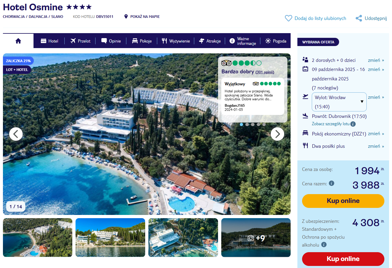 W cenie otrzymujesz przeloty, dwa posiłki dziennie oraz podstawowe ubezpieczenie. Dodatkowym atutem jest bliskość Dubrownika (około 30 km), co daje możliwość zwiedzania tego historycznego miasta.