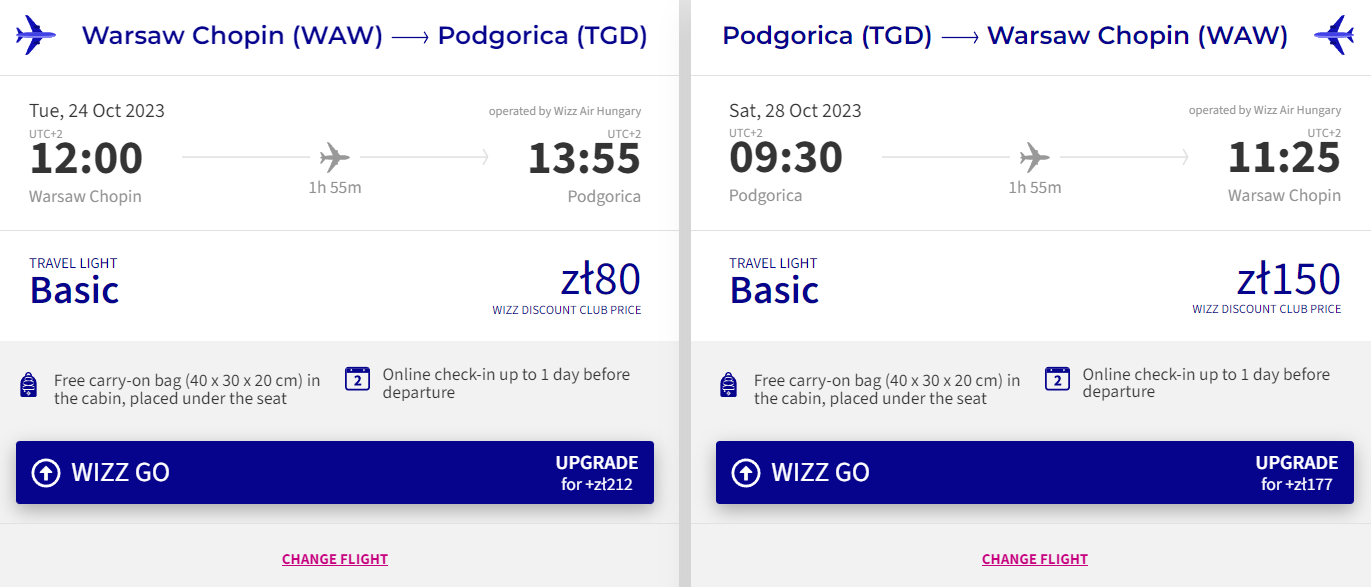 Do Podgoricy udasz się w terminie 24-28 października. Twoja przygoda rozpocznie się na lotnisku w Warszawie. Na Bałkany polecisz na pokładzie samolotu linii lotniczej Wizz Air. Bez dodatkowych kosztów zabierzesz ze sobą sam bagaż podręczny. Bilety w najniższej cenie dostępne są dla członków Wizz Discount Club.