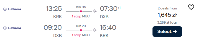 Do Zjednoczonych Emiratów Arabskich udasz się w terminie 13-20 listopada. Podróż odbędziesz linią Lufthansa z Wrocławia, Poznania, Krakowa, Warszawy lub Katowic. Po drodze zaplanowane zostały przesiadki we Frankfurcie. W cenę biletu wliczony został bagaż podręczny i przedmiot osobisty.