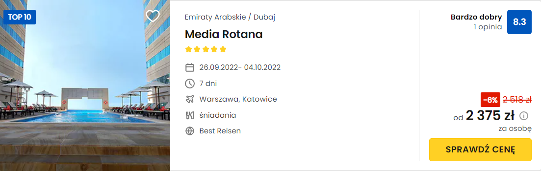 - Cena nie zawiera: Podatku turystycznego Tourism Dirham Fee (płatnego na recepcji)