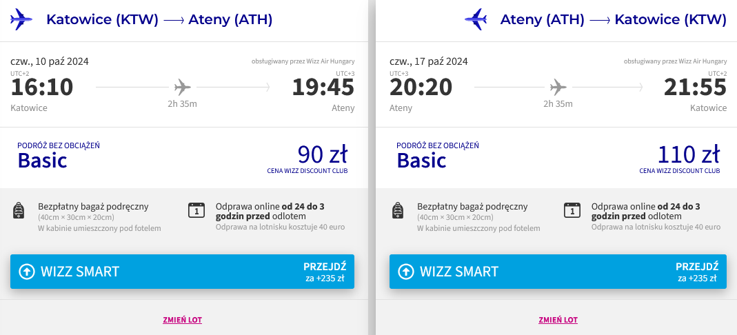 Do Grecji udasz się w terminie 10-17 października. Czeka cię bezpośrednia podróż z Katowic do Aten, linią Wizz Air z bagażem podręcznym. Najniższa cena dostępna jest dla członków Wizz Discount Club.