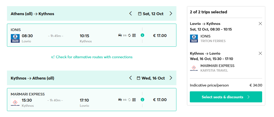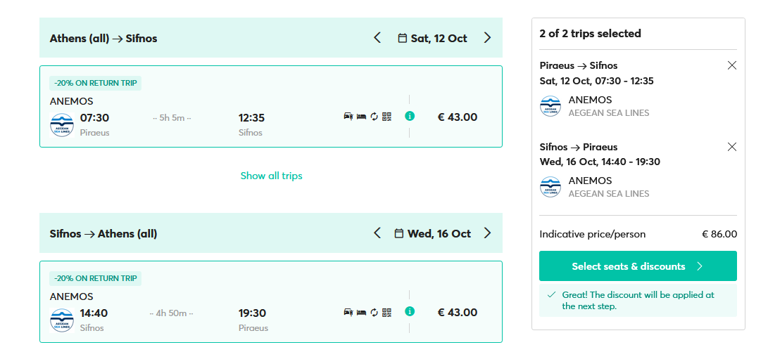 Następnie w Lavrio lub Pireusie wsiądziesz na pokład promu. W terminie 12-16 października będziesz mógł odwiedzić jedną z 3 wysp: Kitnos, Serifos lub Sifnos.