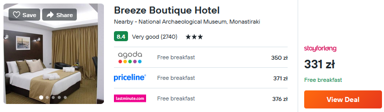 W Atenach proponuję pobyt w 3* hotelu Breeze Boutique, który znajduje się w centrum. W cenę zakwaterowania wliczone są śniadania.