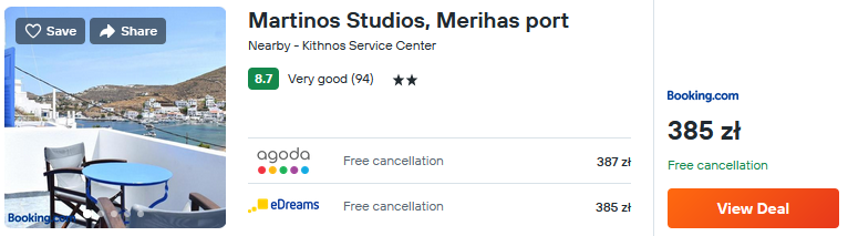 Na wyspie Kitnos rekomenduję zakwaterowanie w znakomicie ocenianym Martinos Studios. Obiekt zlokalizowany jest bezpośrednio przy wybrzeżu.