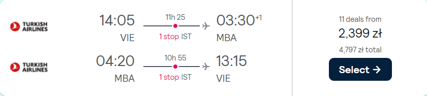 Do Kenii udasz się w przyszłym roku, w terminie 3 (4) – 11 listopada. Czekają cię loty z lotniska w Wiedniu, realizowane na pokładzie samolotów linii lotniczych Turkish Airlines. Po drodze zaplanowano bezpieczne, gwarantowane przez przewoźników przesiadki w Stambule.