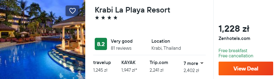 W Krabi polecam noclegi w 4* hotelu La Playa Resort. Na miejscu znajdziesz basen zewnętrzny, strefę spa i siłownię. W cenę zakwaterowania wliczono śniadania.