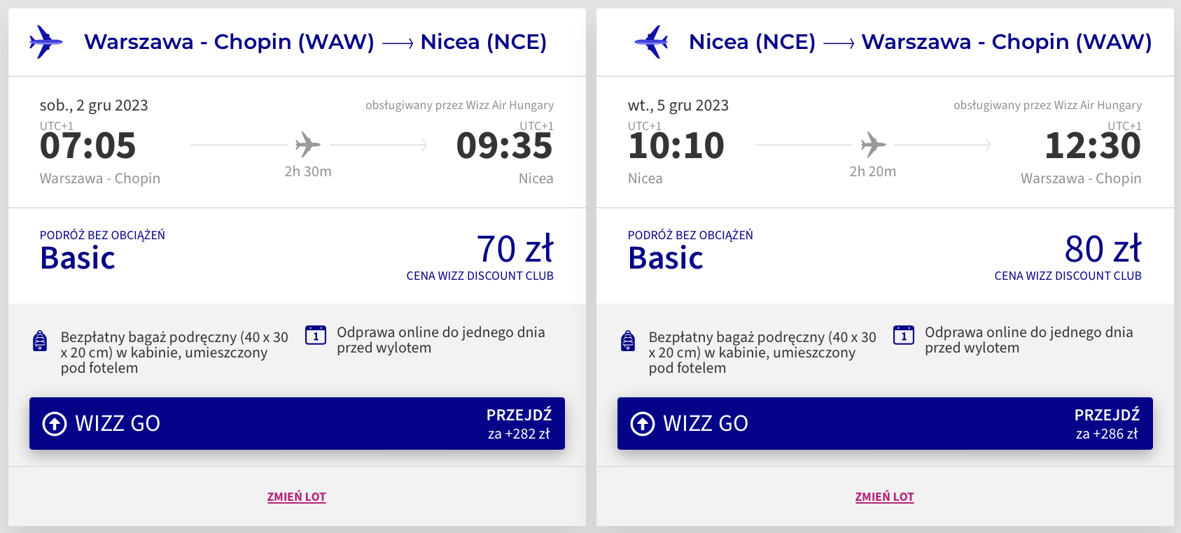 Do Nicei podróżować będziesz z warszawskiego lotniska im. Fryderyka Chopina, w terminie 2-5 grudnia (sobota-wtorek). W obie strony polecisz na pokładzie samolotu linii Wizz Air z wliczonym małym bagażem podręcznym. Bilety w najniższej cenie dostępne są dla członków Wizz Discount Club. Chętni na loty bez WDC zapłacą więcej.