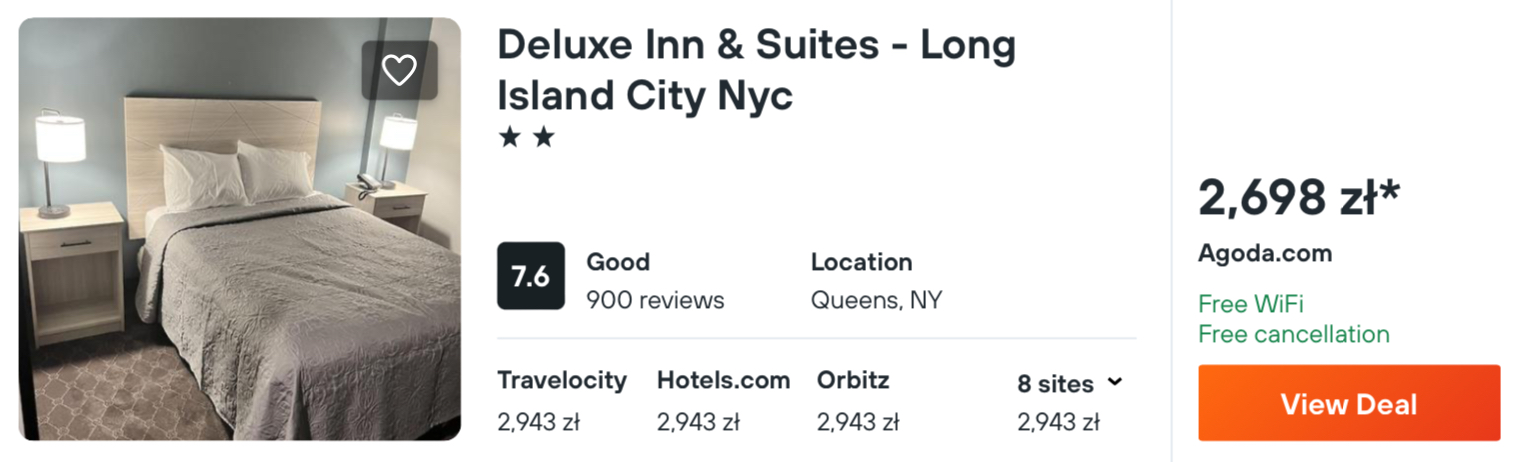 W Nowym Jorku proponuję ci zakwaterowanie w dobrze ocenianym hotelu Deluxe Inn & Suites, który zlokalizowany jest na Long Island. Będzie to świetna baza wypadowa do zwiedzania miasta.