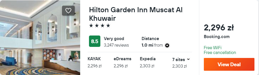 W stolicy Omanu zatrzymasz się w bardzo dobrym 4* hotelu Hilton Garden Inn Muscat Al Khuwair, który znajduje się nieopodal centrum handlowego Oman Avenues. Z lotniska w okolice miejsca noclegowego dojedziesz autobusem lub wypożyczonym samochodem – szczegóły poniżej.