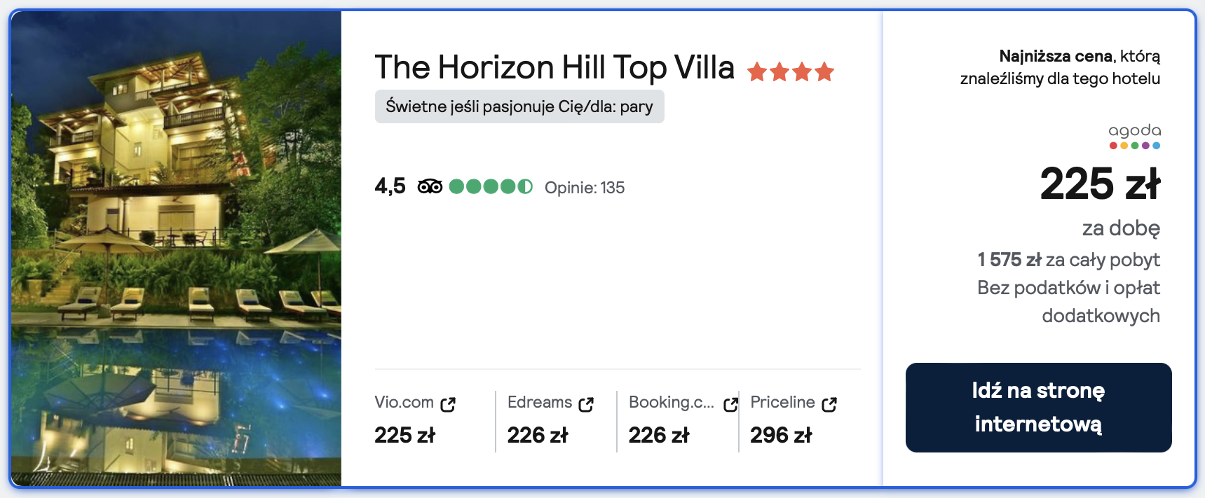 W Sri Lance proponuję noclegi w 4* hotelu The Horizon Hill Top Villa. Obiekt zlokalizowany jest kilka minut spacerem od plaży. Będzie to bardzo dobra baza wypadowa w trakcie wycieczki.