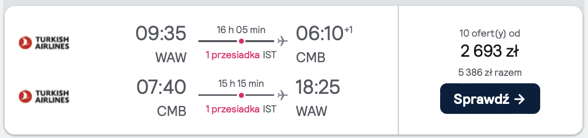 Na wyspę Cejlon udasz się w terminie 22 (23) – 30 listopada. Czeka cię podróż z Warszawy do Kolombo, realizowana na pokładzie samolotów linii lotniczej Turkish Airlines. Po drodze zaplanowano gwarantowane przez przewoźnika przesiadki w Stambule, a w cenie zabrać ze sobą będziesz mógł bagaż rejestrowany (nadawany do luku).