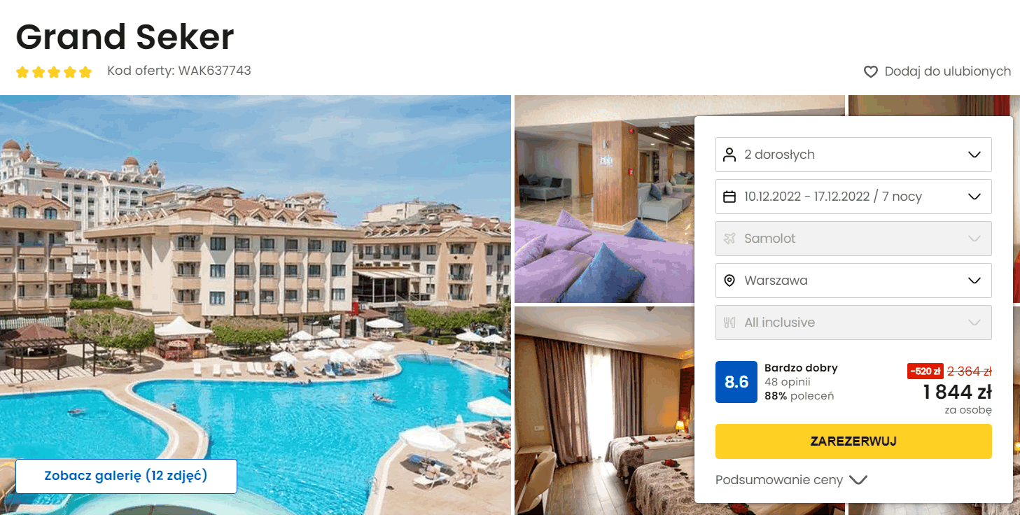 Na miejscu zakwaterowani będziecie w 5* hotelu Grand Seker, który znajduje się w odległości 300 metrów od plaży – leżaki i parasole dla gości hotelowych dostępne są bezpłatne. Na terenie obiektu mieści się basen kryty, basen odkryty z kilkoma zjeżdżalniami oraz basen dla najmłodszych.