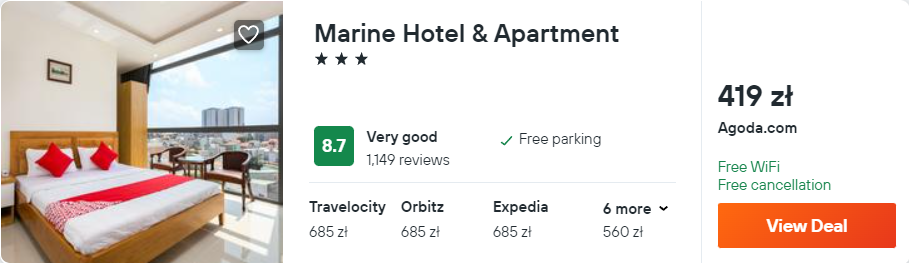 Na miejscu wybrałam dla was zakwaterowanie w Marine Hotel & Apartment, który znajduje się w miejscowości Vung Tau. Obiekt oferuje pokój z prywatną łazienką, dostęp do WiFi, a do tego piękny widok na miasto. Dostaniecie się tam komunikacją miejską.