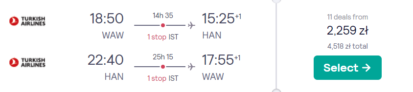 W podróż do Azji wybierzecie się w terminie 1(2) – 9(10) marca. Wasza wycieczka rozpocznie się na lotnisku im. Fryderyka Chopina w Warszawie na pokładzie linii lotniczych Turkish Airlines. Na początek czekają was loty na pokładzie samolotów linii lotniczej Turkish Airlines z bezpiecznymi, gwarantowanymi przez przewoźnika przesiadkami w Stambule. Po przylocie do Hanoi od razu udacie się na południe – do Ho Chi Minh. Podróżować będziecie na pokładzie samolotu linii lotniczej Bamboo Airways.