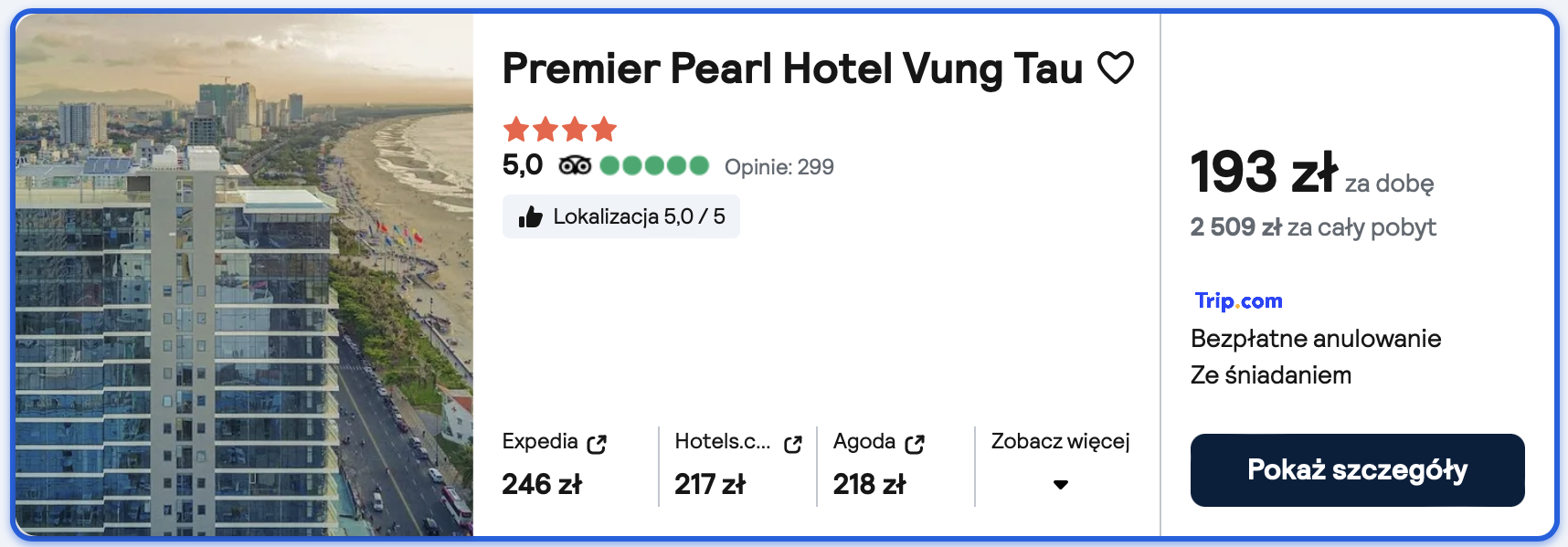 W miejscowości Vung Tau zatrzymasz się w 4* hotelu Premier Pearl Vung Ta, który znajduje się tuż przy plaży. Z lotniska (Ho Chi Minh) w okolice miejsca noclegowego dojedziesz komunikacją publiczną.