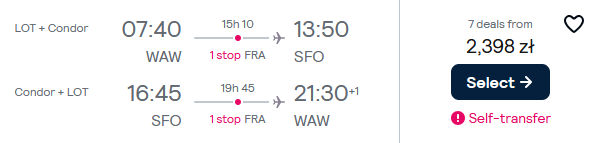 Do USA i z powrotem polecisz liniami Condor i PLL LOT z Warszawy w terminie 18-29 września. Po drodze przesiądziesz się na lotnisku we Frankfurcie.
