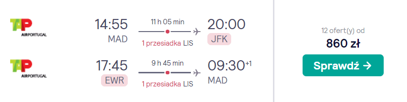 Przykładowy plan podróży z Warszawy do Nowego Jorku za 995 PLN: