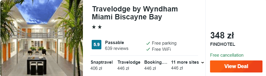 W Miami proponuję wam noclegi w Travelodge by Wyndham Miami Biscayne Bay, który położony jest nad zatoką Biscayne, w sąsiedztwie parku Morningside. Wszystkie pokoje wyposażone są w klimatyzację, telewizor LCD, kuchenkę mikrofalową oraz lodówkę.