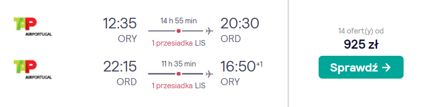 Przykładowy plan podróży z Warszawy do Chicago za 1157 PLN: