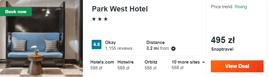 Dowiedzcie się więcej o tym hoteluW Nowym Jorku zatrzymajcie się w 3* hotelu Park West, który położony jest w sąsiedztwie Central Parku. Wszystkie pokoje posiadają łazienkę z wanną. Na terenie całego obiektu zapewniony będziecie mieli dostęp do sieci WiFi.