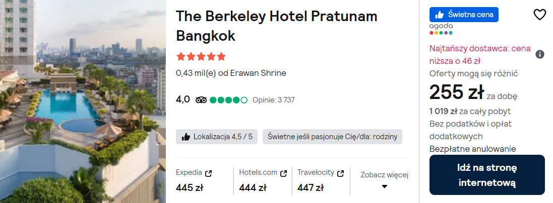 W stolicy Tajlandii proponuję ci noclegi 5* The Berkeley Hotel Pratunam z odkrytym basenem na dachu. W cenie zapewniony będziesz miał dostęp sieci WiFi oraz centrum fitness.