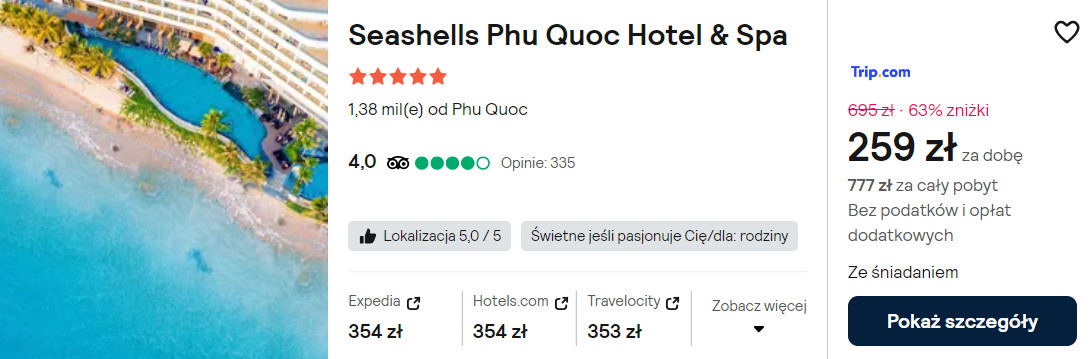 Natomiast na wyspie Phu Quoc zatrzymaj się 5* Seashells Phu Quoc Hotel & Spa z codziennymi śniadaniami. Znajduje się on w sąsiedztwie piaszczystej plaży. Na terenie obiektu mieści się odkryty basen.