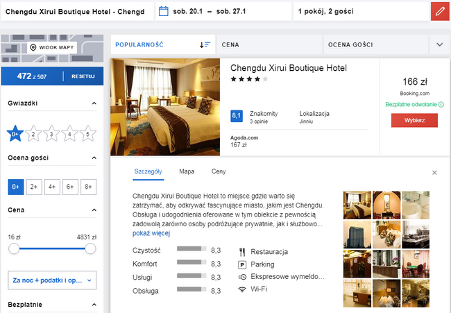 Na miejscu proponuję Wam zakwaterowanie w 4* Chengdu Xirui Boutique Hotel za 166 PLN/pokój za noc. Każdy z pokoi wyposażony jest w klimatyzację, telewizor z płaskim ekranem, czajnik bezprzewodowy, łazienkę z prysznicem. Obiekt znajduje się w odległości 200 metrów od parku Jinniu. Jest to świetny wybór dla osób, które interesują się ulicznymi straganami z jedzeniem i krajobrazami.
