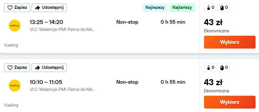 Przygotowana przeze mnie wycieczka składa się z 4 niezależnych rezerwacji przelotów. Trzech linią Ryanair (Warszawa Modlin-Malaga, Malaga-Walencja i Majorka-Warszawa) oraz jednego loty linią Vueling (Walencja-Majorka).