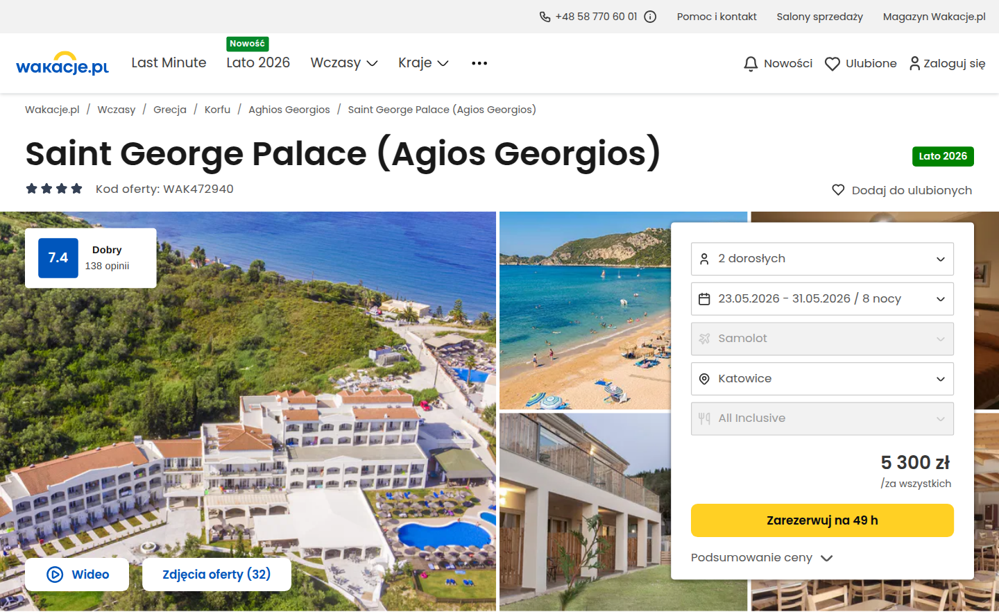 Zakwaterowanie zapewnione jest w 4* hotelu Saint George Palace, położonym na wzgórzu w kameralnym kurorcie Agios Georgios. Obiekt zachwyca nowoczesnym, modernistycznym wystrojem i oferuje piękne widoki na okolicę. Goście chwalą przede wszystkim dwa baseny ze słodką wodą, zjeżdżalnie dla dzieci oraz przyjazną atmosferę. Hotel znajduje się około 400 metrów od szerokiej, piaszczystej plaży, na którą można dojść spacerem.