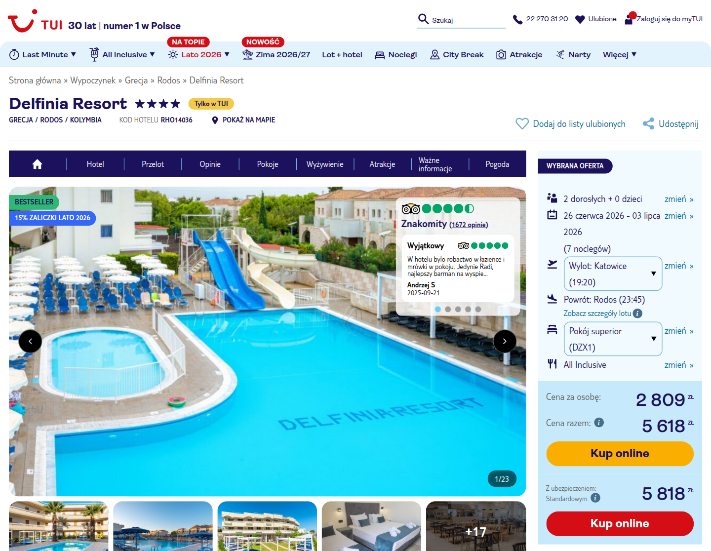 Na miejscu czeka Delfinia Resort – 4* hotel, znajdujący się zaledwie 350 m od plaży. Goście chwalą obiekt za przyjazną atmosferę, czystość i dobrze zorganizowaną strefę basenową. Rodziny z dziećmi doceniają plac zabaw oraz specjalne menu dla najmłodszych. Hotel oferuje też szeroką strefę gastronomiczną, rozrywkową i sportową.