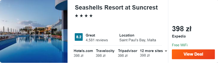 Dowiedzcie się więcej o tym hoteluNa Malcie wybrałem dla was ofertę pobytu w 4* Seashells Resort at Suncrest, który położony jest nad zatoką Świętego Pawła. Na miejscu zakwaterowanie będziecie w klimatyzowanym pokoju, wyposażonym w telewizor LCD, lodówkę oraz zestaw do parzenia kawy lub herbaty.