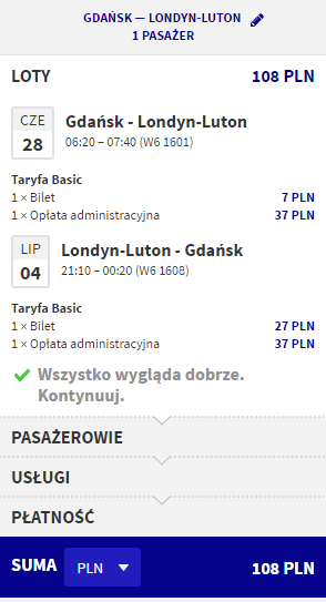 Wizz Air | Londyn (Luton) 21:10 – Gdańsk 00:20 | 74 PLN (WDC) | 4 (5), 5 (6) lipca