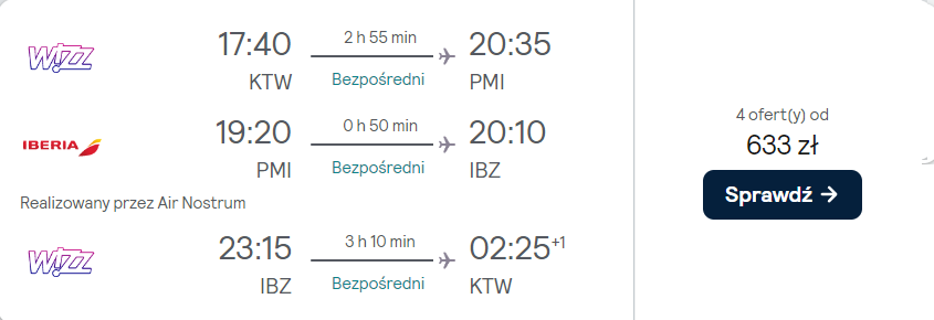 Twój wyjazd rozpocznie się 24 lipca na lotnisku w Katowicach, kiedy to polecisz na Majorkę. 31 lipca udasz się na Ibizę. 4 sierpnia czeka cię lot powrotny do stolicy województwa śląskiego. Podróżować będziesz na pokładach samolotów Wizz Air i Iberia z wliczonym bagażem podręcznym.