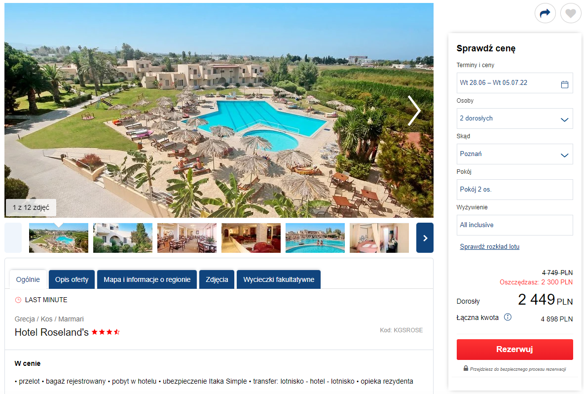 Na urlop do Grecji udacie się na początku tegorocznego sezonu, w terminie 28 czerwca – 5 lipca. Czeka was bezpośredni lot na wyspę Kos, realizowany na pokładzie samolotu linii lotniczej Enter Air. W cenę pakietu wliczono bagaż rejestrowany, transfery oraz opiekę rezydenta. Możecie wybrać miejsce wylotu spośród 3 miast: Warszawy, Katowic oraz Poznania.