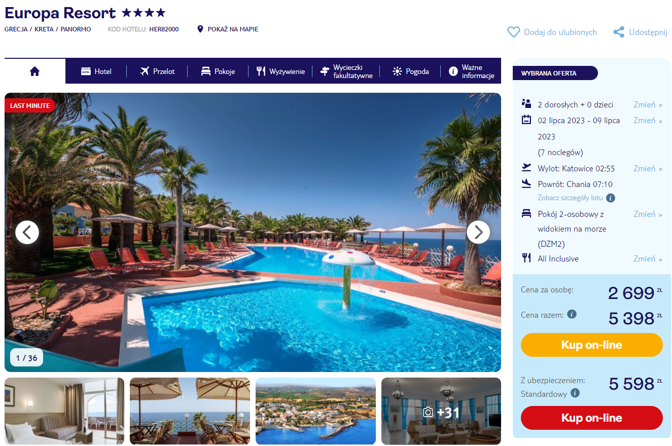 Urlop spędzisz w 4* hotelu Europa Resort. Kompleks zlokalizowany jest bezpośrednio przy wybrzeżu. Do twojej dyspozycji będzie przytulnie urządzony pokój z prywatną łazienką, balkonem i klimatyzacją oraz odkryty basen z tarasem słonecznym.