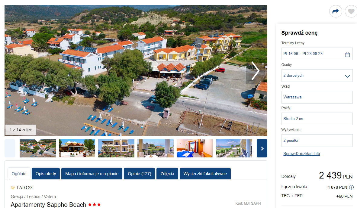 Na wypoczynek do Grecji udasz się w terminie 16 – 23 czerwca. Czeka cię bezpośredni lot z Warszawy na wyspę Lesbos, a w cenę wliczono bagaż rejestrowany (nadawany do luku).