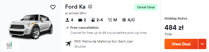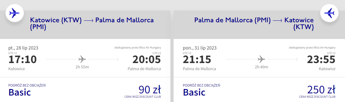 Do Hiszpanii polecisz w terminie z weekendem (piątek – poniedziałek) 28 – 31 lipca. Czeka cię bezpośredni lot na Majorkę z Katowic, realizowany na pokładzie samolotu linii lotniczej Wizz Air. Bilety w najniższej cenie zarezerwują posiadacze Wizz Discount Club, pozostałe osoby zapłacą nieco więcej.