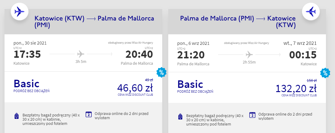 Na Baleary polecicie na pokładzie samolotu linii lotniczej Wizz Air z lotniska w Pyrzowicach. Do Hiszpanii wybierzecie się w dniach 30 sierpnia – 6 września. Pamiętajcie, że najtaniej bilety kupią członkowie Wizz Discount Club – pozostali chętni zapłacą nieco więcej. W cenę wliczony jest wyłącznie mały bagaż podręczny. Przeczytajcie nasze wskazówki, jak się spakować, a nie powinno to stanowić problemu.