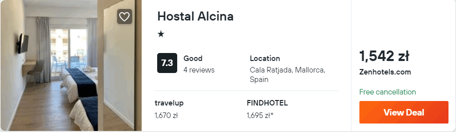 Na Majorce zakwaterowanie będziecie w obiekcie – hostal Alcina, który znajduje się w miejscowości Cala Ratjada. Z lotniska w okolice miejsca noclegowego (przystanek Cala Agulla) dojedziecie autobusem lub wypożyczonym samochodem – szczegóły poniżej.