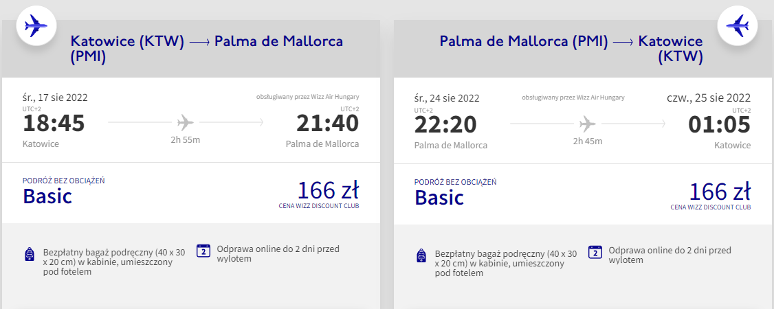 Na hiszpańską wyspę udacie się w terminie 17-24 sierpnia, z katowickiego lotniska w Pyrzowicach. W obie strony polecicie bezpośrednio na pokładach samolotów linii Wizz Air. Bilety w najniższej cenie dostępne są dla osób z Wizz Discount Club, chętni na loty bez WDC zapłacą nieco więcej.